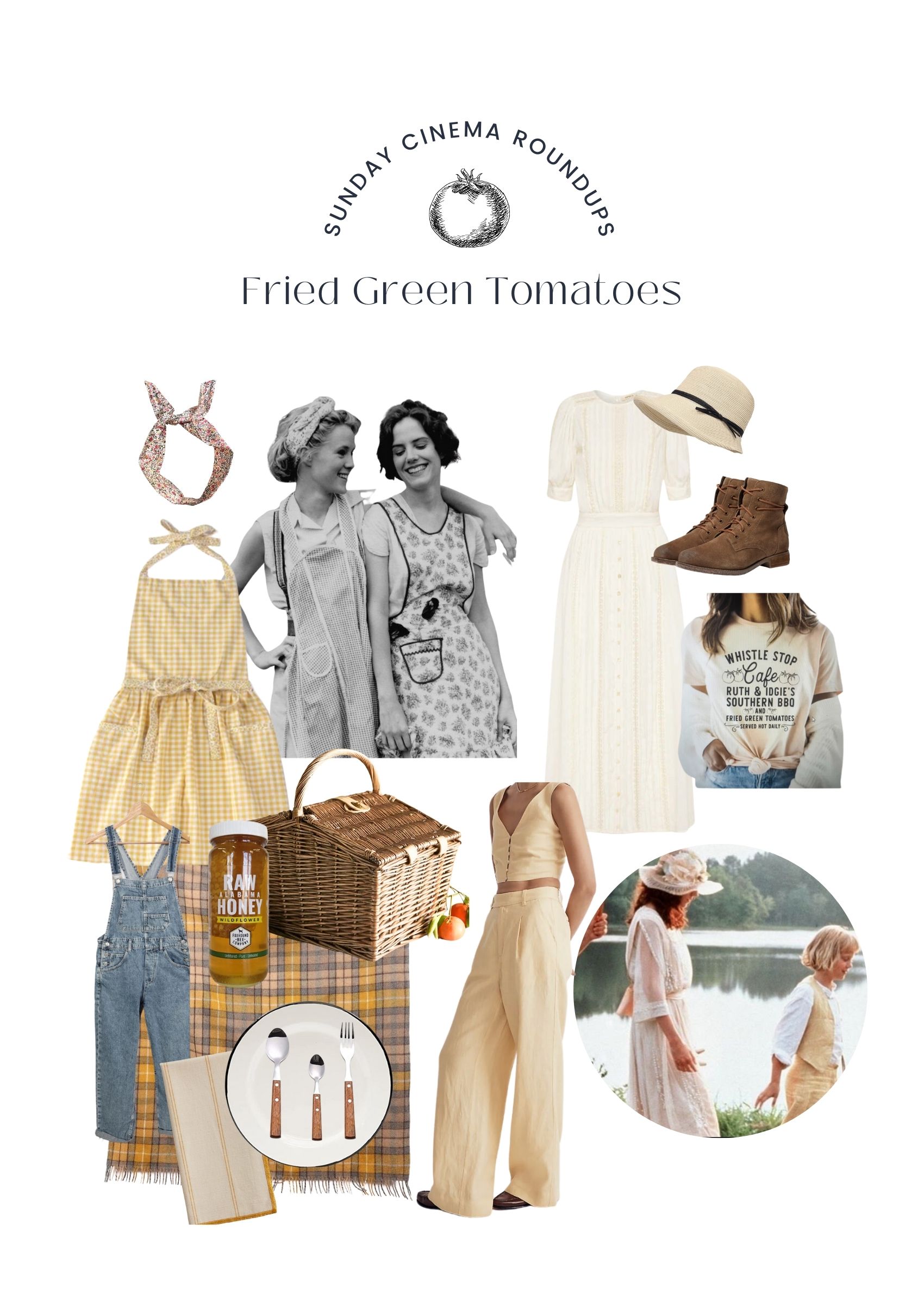 Its a lazy sunday afternoon where the evening light just hits all the right spots that make it glow, the windows are open and the curtains sway in tandem with the soft breeze. Its warm outside and the kids are winding down, they head over to the grandparents house for the evening and you have the house all to yourself! What are you going to do? Call your bff over right away of course ! What to do? Well, that my friend I have got covered. Sundays are for nostalgic movies I say- you know the ones. The ones with the best lighting, actors that feel like your friends and scenery that makes you want to go shopping for that vintage table and that gingham apron to recreate the “vibe”. I introduce to you my #1 favorite summer movie: Fried Green Tomatoes. If you have seen it you know what I mean and if you haven’t? Well, you are in for a treat. This is a movie to see with your girlfriends, I just adore everything about this movie from the set to the clothes. Before you sit down don’t forget to grab my recipe for what I call “Towanda Sparkling Peach Smash” and make the famous fried green tomatoes from the Whistle Stop Cafe Cookbook. I have also included my roundups for my favorite goods inspired by the movie so you can recreate these vibes in your home. Now, you have to tell me your favorite scene from the movie. Mine is the the pie fight scene.