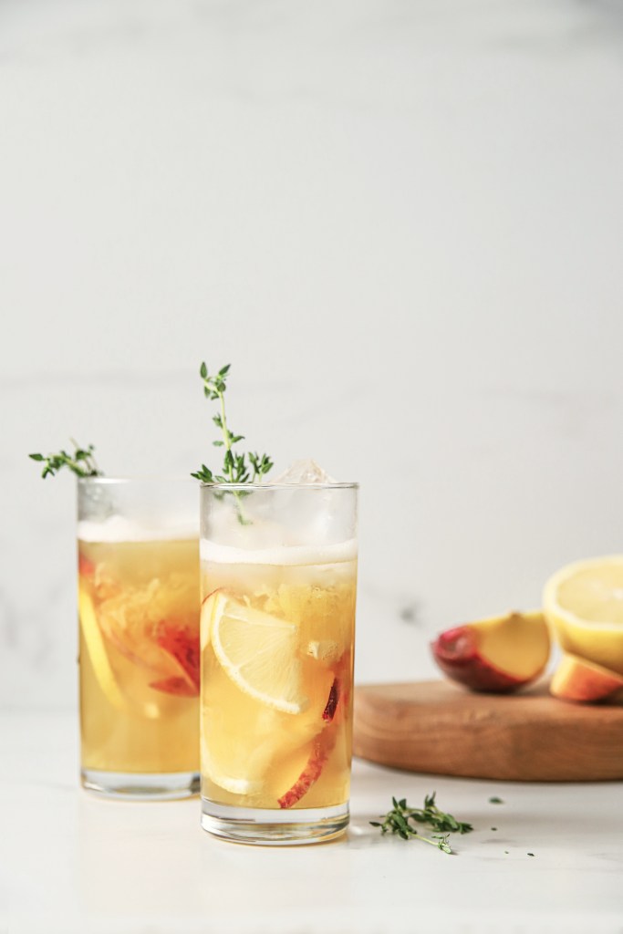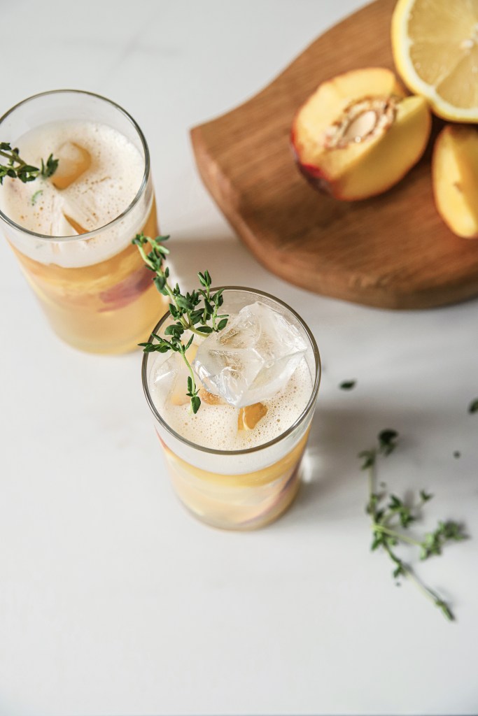 - Once muddled, then add the following to each of the 2 glasses : 1.5 oz of bourbon , 1/2 Cup pineapple juice , 1/2 Cup peach juice and top off with peach flavored sparkling water and sprig of thyme and extra peaches for garnish